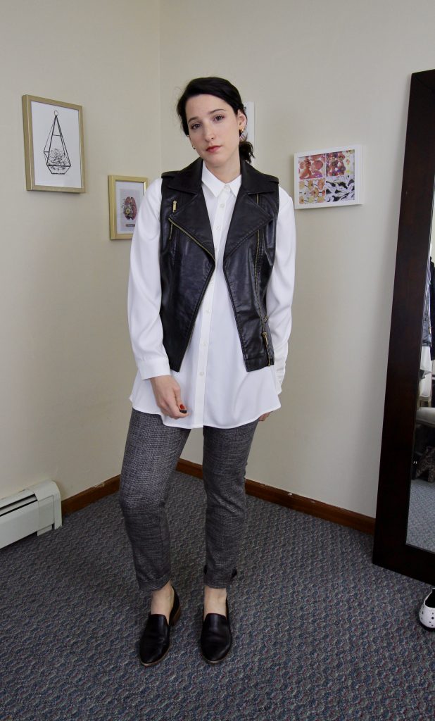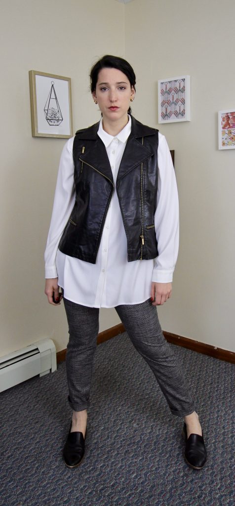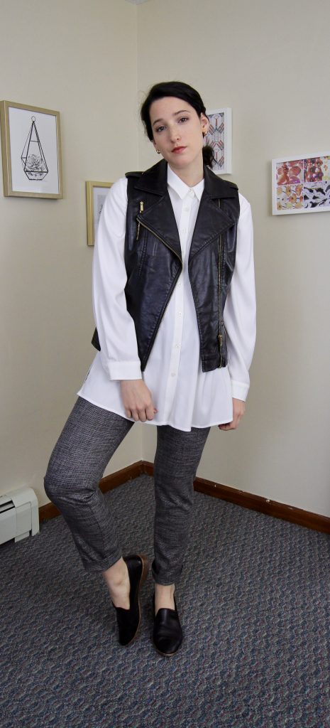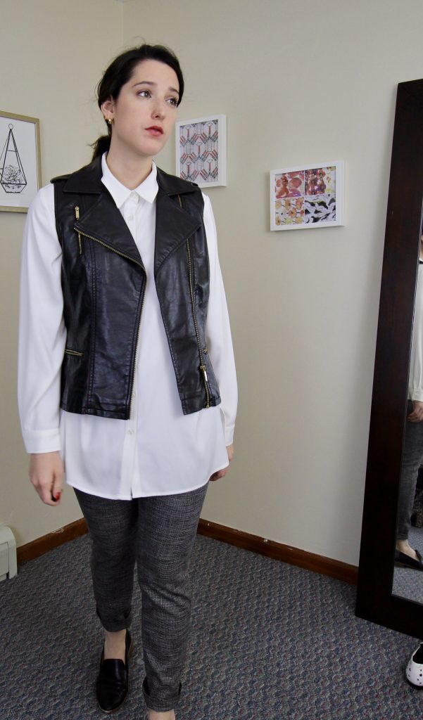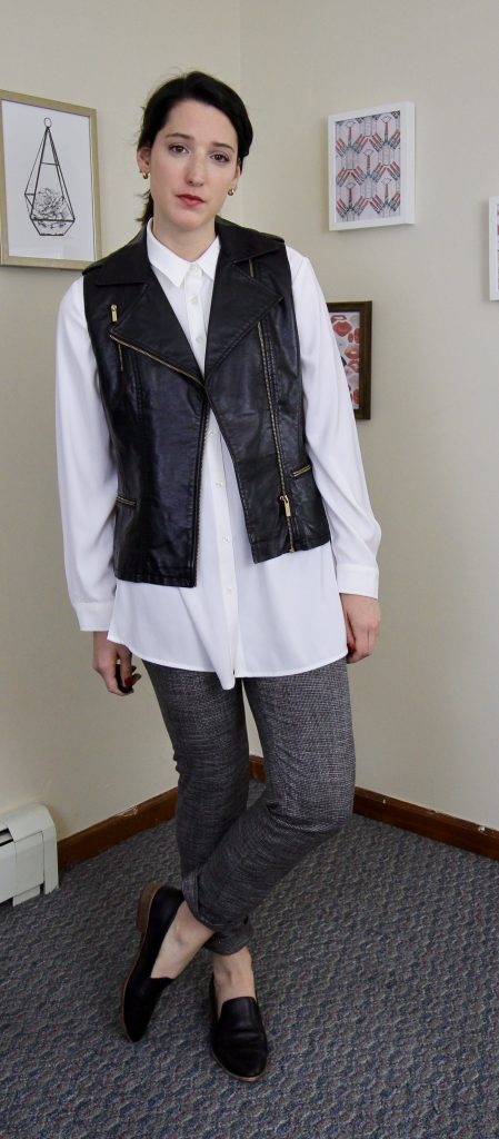 With that in mind, I added a more of an edgy element with the leather (not sure if its faux or not) vest. I think the black leather adds a great contrast on a few levels. First the actual colors are contrasting, which adds some interest to this relatively simple silhouette. Next, is the contrasting fabrics, the silky and drapey blouse contrast the structured leather vest to add more dimension to this outfit.